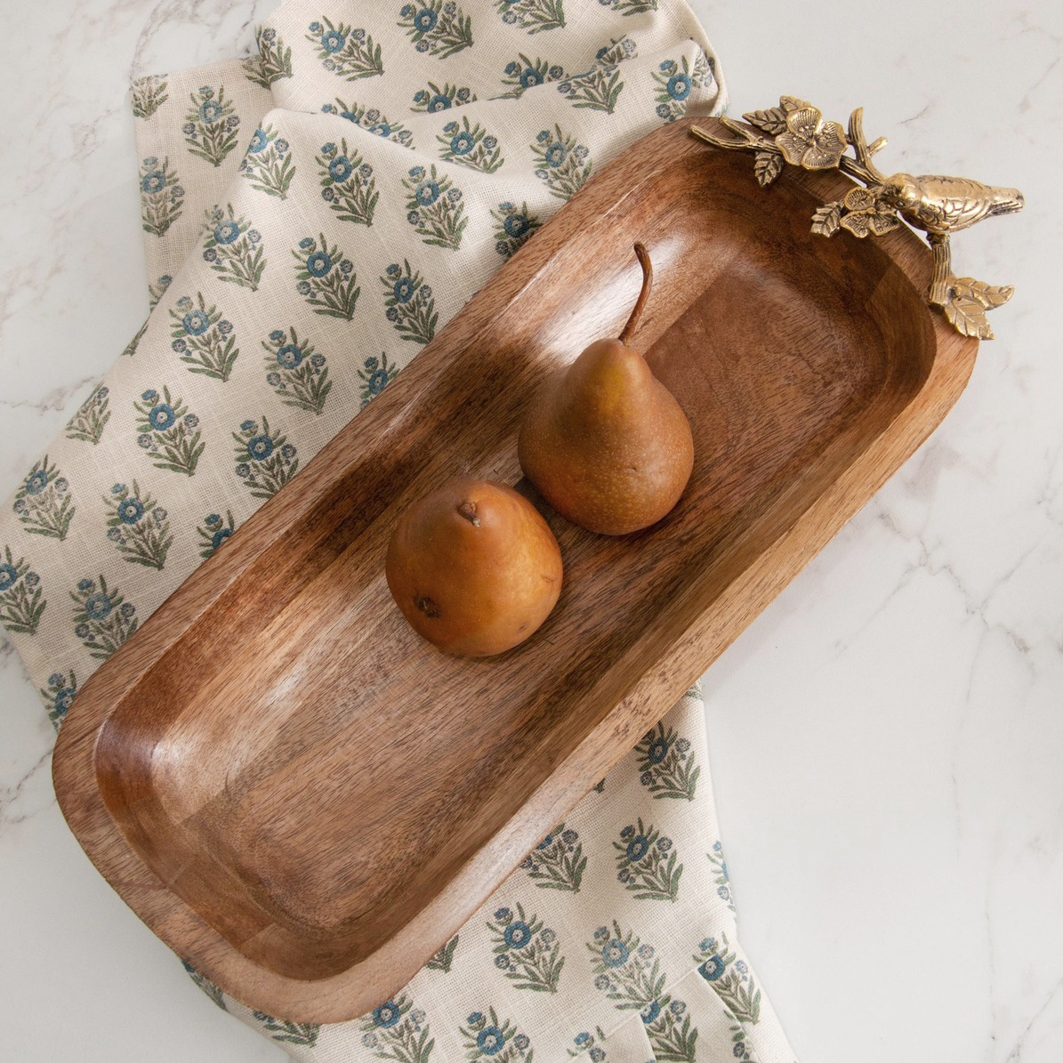 Oval Mango Wood Dough Bowl with Brass Bird and Flower